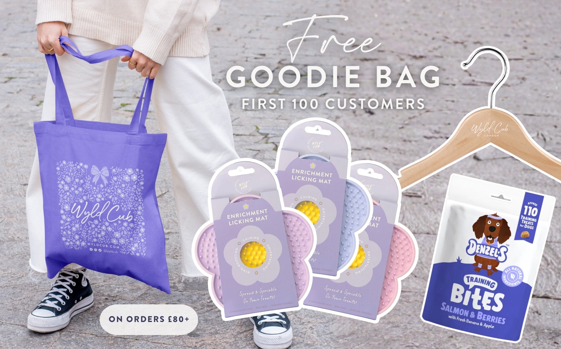 Contains a new branded wooden harness hanger (Small / Large), a Wyld Cub branded tote bag, a pack of Denzels Salmon & Berries treats, a Wyldflower Enrichment Mat (in one of four colours). While stocks last.
