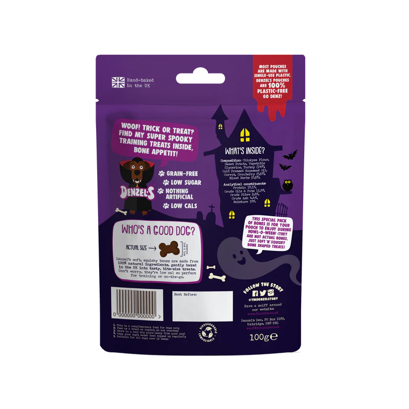 Denzel’s Spooktacular Bones are made with natural ingredients such as turkey, pumpkin & apple! These healthy, low calorie Spooktacular bones are perfect when training, walking or out and about.